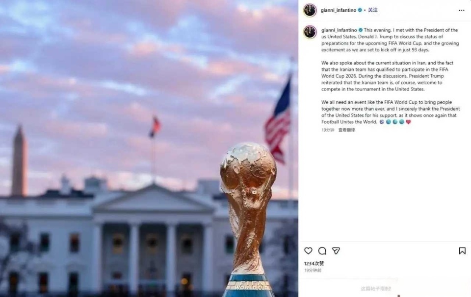 就在北京时间今天,一则消息突发,FIFA主席因凡蒂诺发文,表示自己已经与美国总统特朗普有过谈话,伊朗男足参加世界杯没有问题。