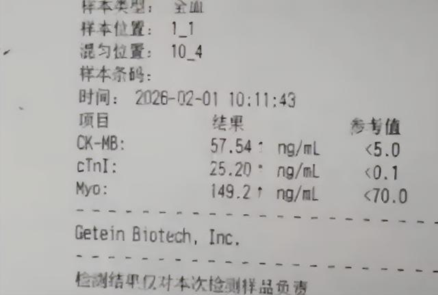 (▲心肌酶检测报告:肌钙蛋白:25.20ng/ml↑,肌红蛋白:149.2ng/ml↑,肌酸激酶同工酶:57.54ng/ml↑明显偏高提示心肌坏死。)