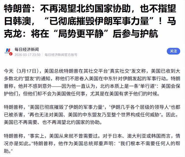 毕竟北约的集体防御条款,只适用于成员国领土受攻击,这场冲突是美国单方面发起的,北约没义务参与。