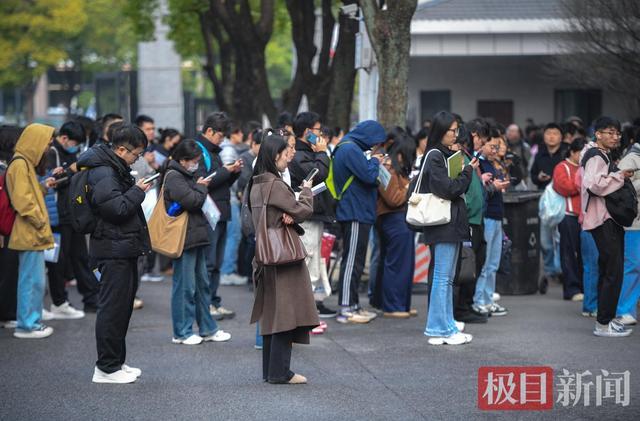 上午8时,极目新闻记者在湖北大学考点外看到,很多考生已经到达,排队等候入场,期间不少人仍在争分夺秒进行复习。