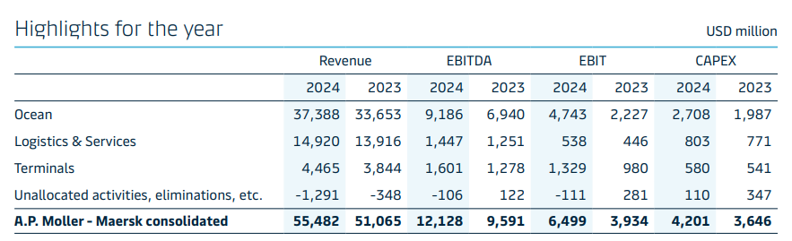 马士基各板块营收,总营收554.82亿美元,航运营收373.88亿美元,占67.38% 。 图表来自马士基2024年年报