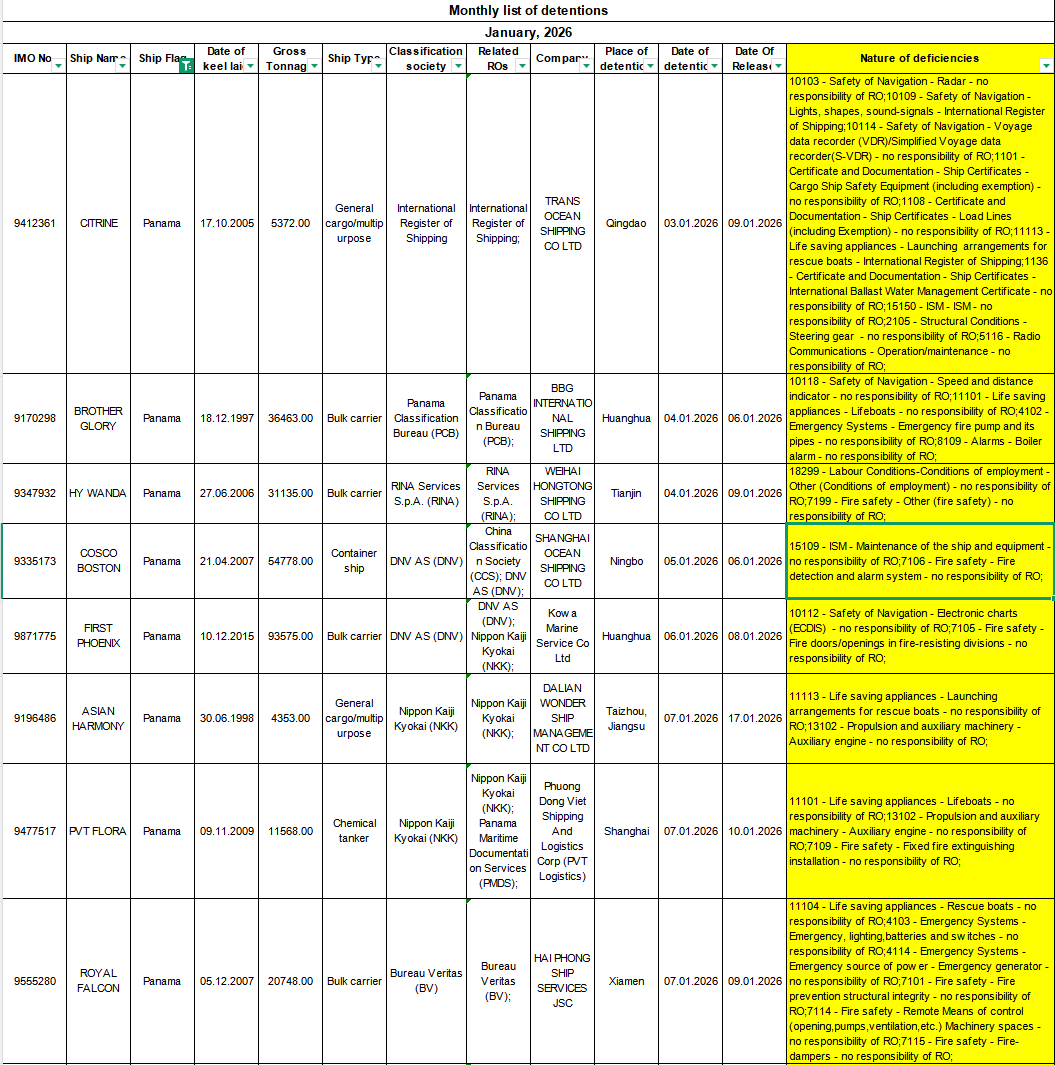 2026年1月份在港口国监督检查中滞留的巴拿马籍船舶清单,黄色部分为滞留原因