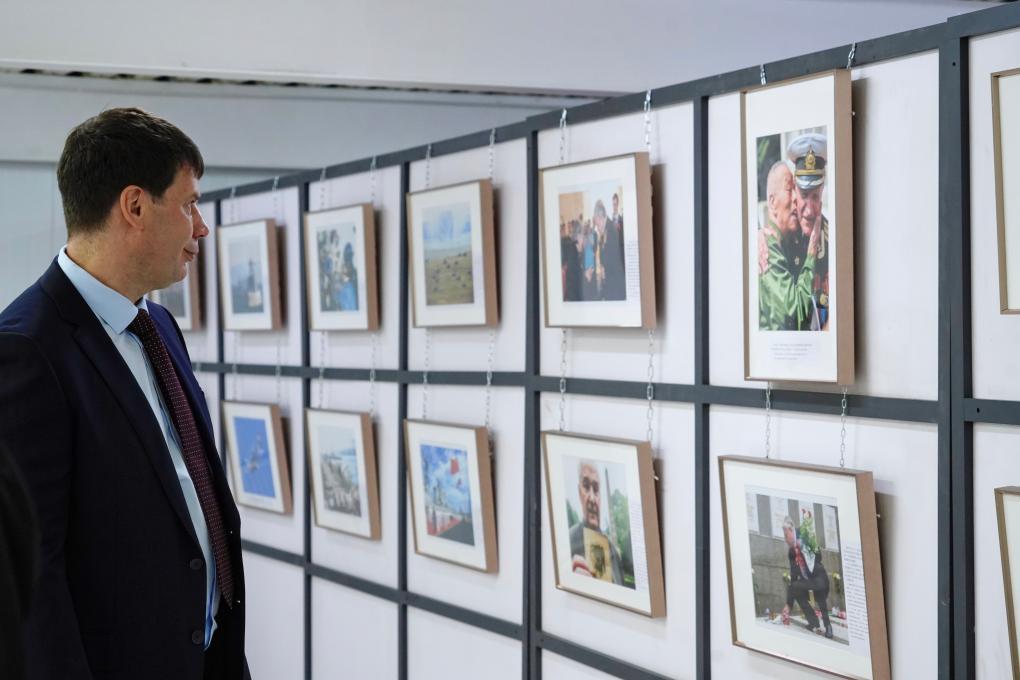 8月28日,在俄罗斯圣彼得堡,一名男子参观纪念中国人民抗日战争暨世界反法西斯战争胜利80周年图片展。新华社记者 周天翮 摄