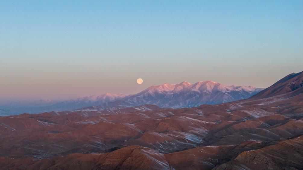 这是1月14日在新乌鞘岭隧道附近拍摄的山脉与月亮(无人机照片)。新华社记者 郎兵兵 摄