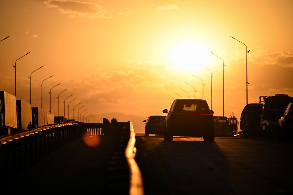 运输公司工作人员将中国新能源车从霍尔果斯运向哈萨克斯坦一侧中转停车场。新华社记者 李任滋 摄